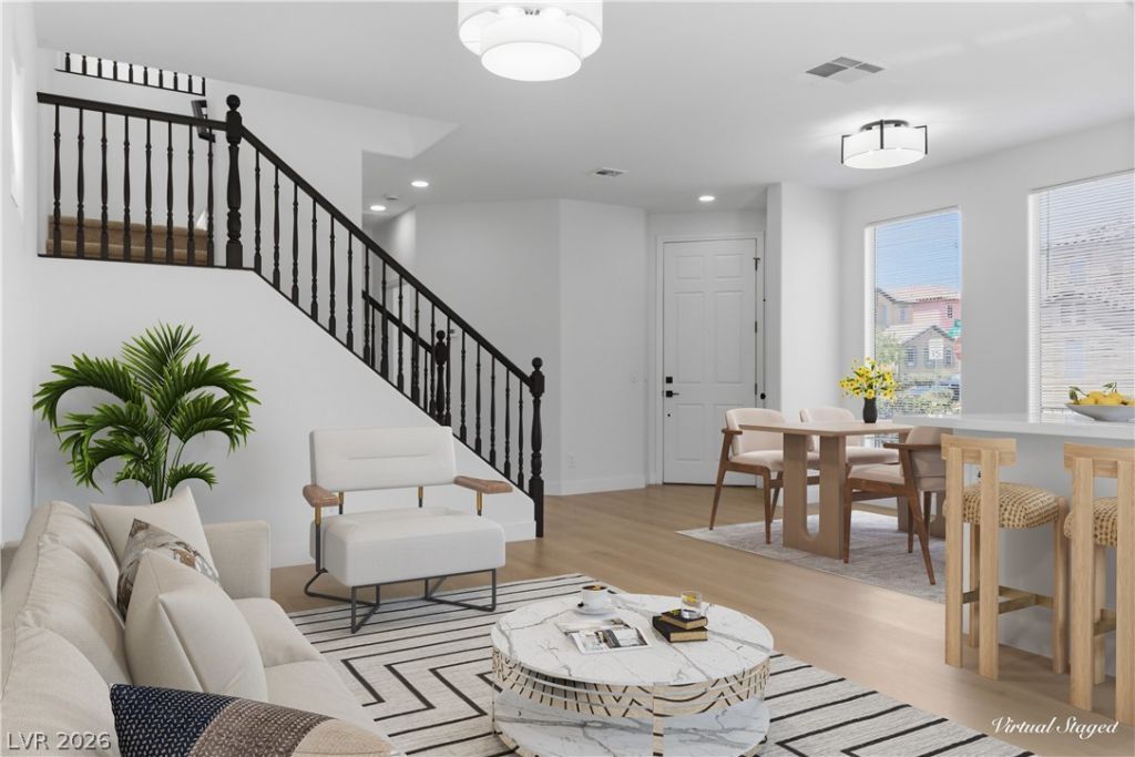 Welcome home to this beautifully remodeled two-story residence situated on a corner lot in the gated Tides II community. This move-in ready home features three bedrooms, including one downstairs, an upstairs loft, and backyard patio. Amenities include a pool, spa, fitness center, walking trails, and CC&Rs, all with quick access to I-15. Inside, the home is filled with natural light and showcases custom light fixtures, plush carpeting, and laminate wood flooring throughout. The upgraded kitchen offers recessed lighting, shaker cabinetry, custom countertops with gold hardware, a pantry, stainless steel appliances, and an island with seating. Spa-inspired bathrooms feature dual vanities with framed oval mirrors, upgraded lighting, and custom-tiled showers with rainfall shower heads and built-in niches.